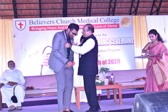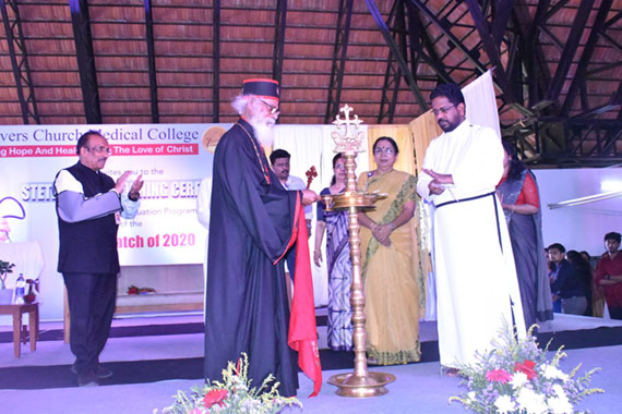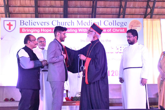 His Holiness Moran Mor Athanasius Yohan-I, Metropolitan of the Believers Eastern Church graced the ceremony. As chief guest, he delivered the inaugural address, prayed for and blessed the stethoscopes, and proudly donned the stethoscopes on three blessed students. He was extremely happy about the program.